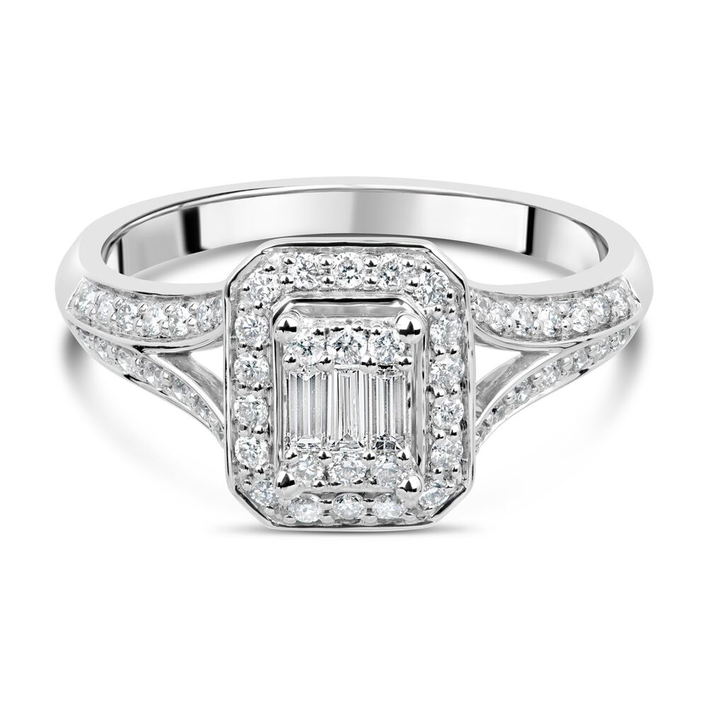 An 18-carat white gold ring with an octagonal setting holding 0.50-carats of baguette diamonds, surrounded by a halo diamond cluster.