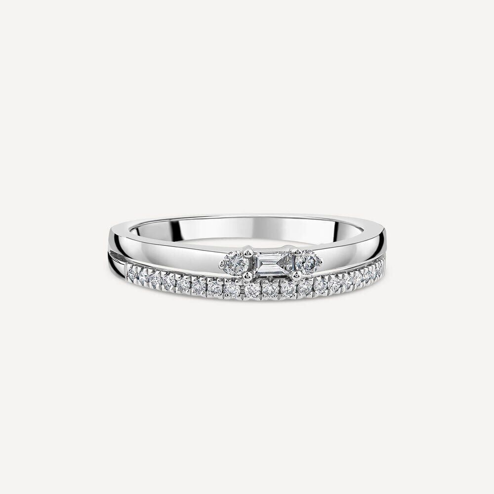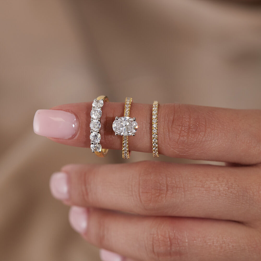 Your engagement ring sets the tone, but the wedding band or eternity ring brings harmony to your stack. Look for shapes, textures, or stones that enhance your center piece while reflecting your own aesthetic.