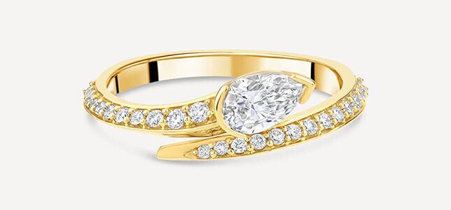 A sculptural twist design brings a fashion-forward feel to this 0.58ct pear-shaped diamond ring. Organic curves feel modern and elegant, perfect for intimate celebrations where unique design details will get noticed around the table. Part of the Born Kissed by Diamonds collection, this playful design is a more affordable way to capture all the sparkle warranted for a big dressy occasion.