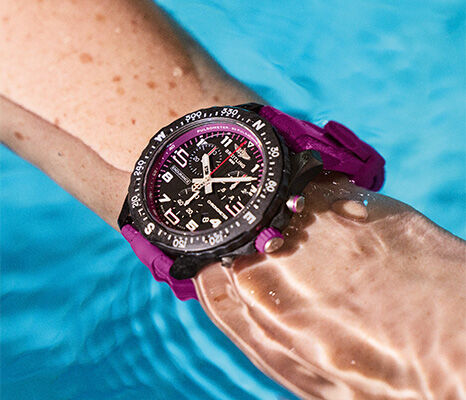 The new 38 mm models feature coloured straps and crowns matching the inner bezel rings in purple, pink, white, light blue, or red. Hands and oversized numerals are coated with Super LumiNova® for readability in low light. Powered by a thermocompensated SuperQuartz™ movement, the Endurance Pro is ten times more accurate than conventional quartz and is COSC-certified.