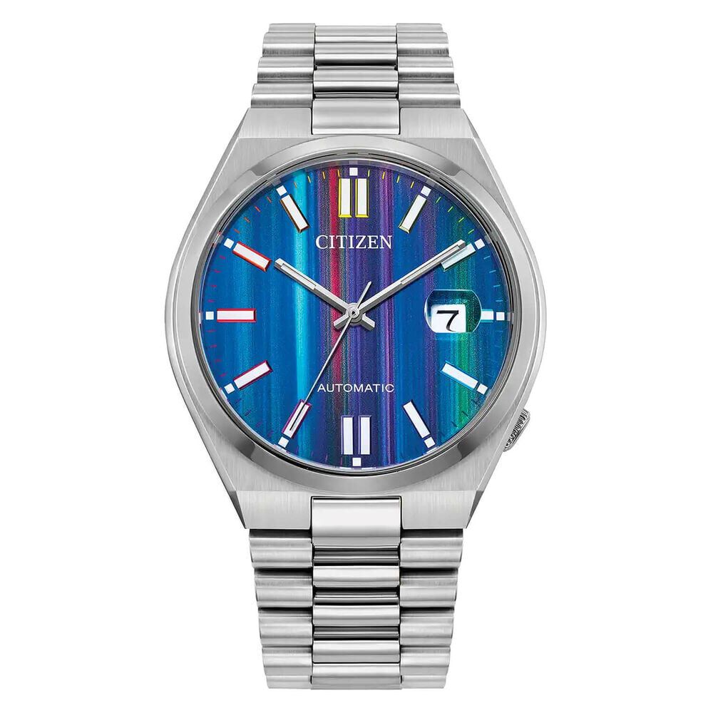 Nicknamed "Tsuyosa" (meaning "strength" in Japanese), the NJ015 Automatic first appeared in 2022. It features the in-house caliber 8210 movement, visible through an exhibition caseback, with a beat rate of 21,600VPH and a 40-hour power reserve. On the dial side, you'll find a three o'clock date aperture with a magnifier and luminescent baton markers. These vibrant integrated steel watches are bold, eye-catching, and offer great value.