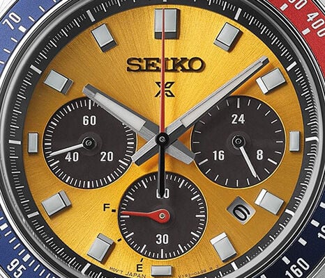 The new Seiko Prospex Pogue Solar Chronograph 1969 Re-Interpretation retains the distinctive coloring of the original. The bezel is aluminum with red and blue hues, featuring a white tachymeter scale. The yellow dial with red chronograph hands includes three sub-counters at 3, 6, and 9 o’clock, offering a 24-hour timer, a 60-minute counter in 1/5th increments, and a small seconds counter. The baton hour markers are coated with luminous material, and the grey-black chronometer second scale is protected by anti-reflective, scratch-resistant sapphire crystal glass.