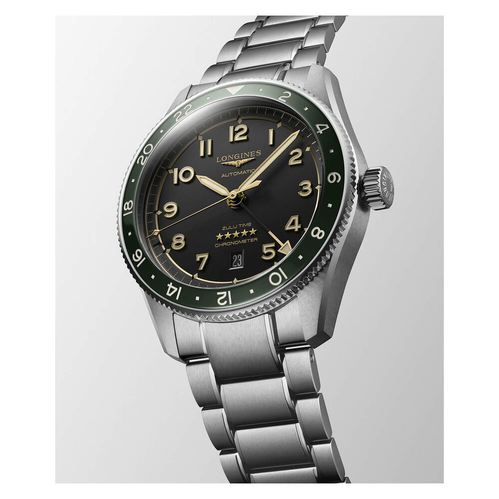 The Longines Spirit Zulu is a line designed to reflect the precision instruments that once accompanied adventurers conquering air, sea, and land. Linking history with innovation, this collection combines elements borrowed from the pioneering world of aviation with today's aesthetic and technical requirements. This model features a 42mm matt black dial with a green bezel and is fitted with a steel bracelet. A glowing tribute to these exceptional men and women who, by a record, an exploit or a display of courage, have left their mark on history - pushing new generations to surpass themselves.