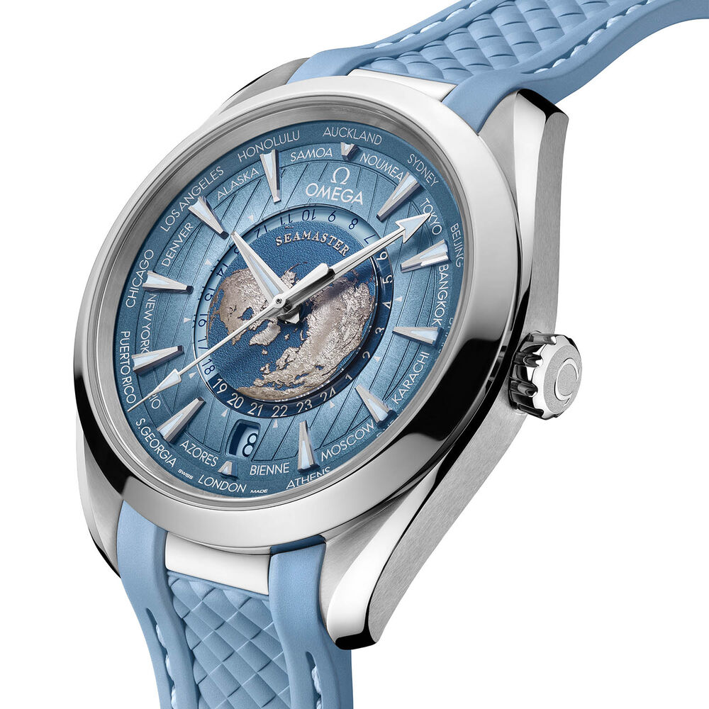 Introducing the OMEGA Worldtimer watch, a stunning timepiece that effortlessly combines style and functionality. With its 43 mm polished and brushed stainless steel case and integrated blue rubber strap, this watch exudes a sense of sophistication and versatility.The sun-brushed Summer Blue finish with vertical teak stripes adds a touch of texture and depth, creating an eye-catching display. Rhodium-plated hands and indexes filled with light blue Super-LumiNova ensure easy readability in any lighting condition.One of the standout features of this timepiece is the circle of silvery printed global destinations that encircles the dial. This design element not only adds a touch of elegance but also serves as a reminder of the vastness of our world. The 24-hour glass ring at the center of the dial, with its light blue and dark blue segments, allows for convenient tracking of different time zones.The dial also features a laser-ablated Earth depiction on a grade 5 titanium plate. The vivid blue ocean and relief of the continents showcase exceptional attention to detail and craftsmanship.Flipping the watch over, you'll find a stamped commemorative Seamaster logo on the caseback. This logo depicts a trident-bearing Poseidon and two seahorses, symbolizing OMEGA's rich heritage. Behind the caseback lies the Co-Axial Master Chronometer Calibre 8938, ensuring precise and reliable timekeeping.* *