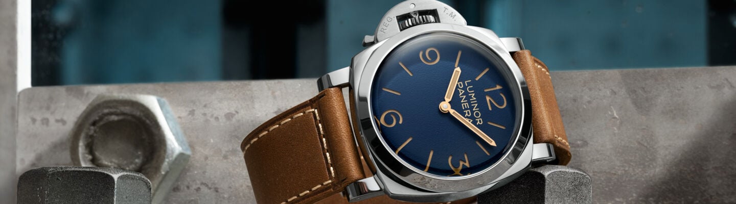 Where the tobacco-dial Luminor leans into warmth and vintage texture, the Destro takes a slightly sharper approach. Its matte grainy blue dial keeps the sandwich construction, beige Super-LumiNova and vintage-inspired double pencil hands, but drops the small seconds for a cleaner display. The result is simpler and more graphic, giving the watch a distinct identity while keeping it firmly within the same family.