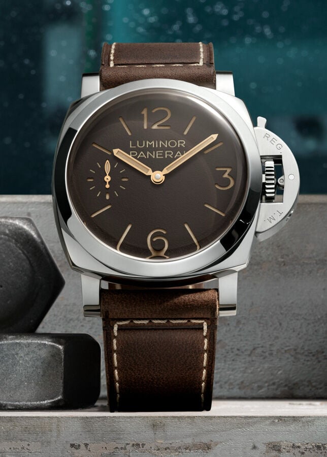 The dial is what gives this version its strongest personality. Panerai brings back a deep tobacco tone to the collection, pairing it with a matte grainy finish, sandwich construction, beige Super-LumiNova and vintage-inspired double pencil hands. A small seconds display at 9 o’clock completes the look, reinforcing the sense that this is the more traditional and overtly heritage-driven watch of the pair. The effect is warm, understated and very much in keeping with the brand’s vintage design codes.