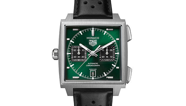 The 2026 TAG Heuer Monaco Chronograph is available in a range of dial options, including blue, green, and black with rose gold accents. Each version offers a slightly different look, while keeping the same clear and balanced layout.