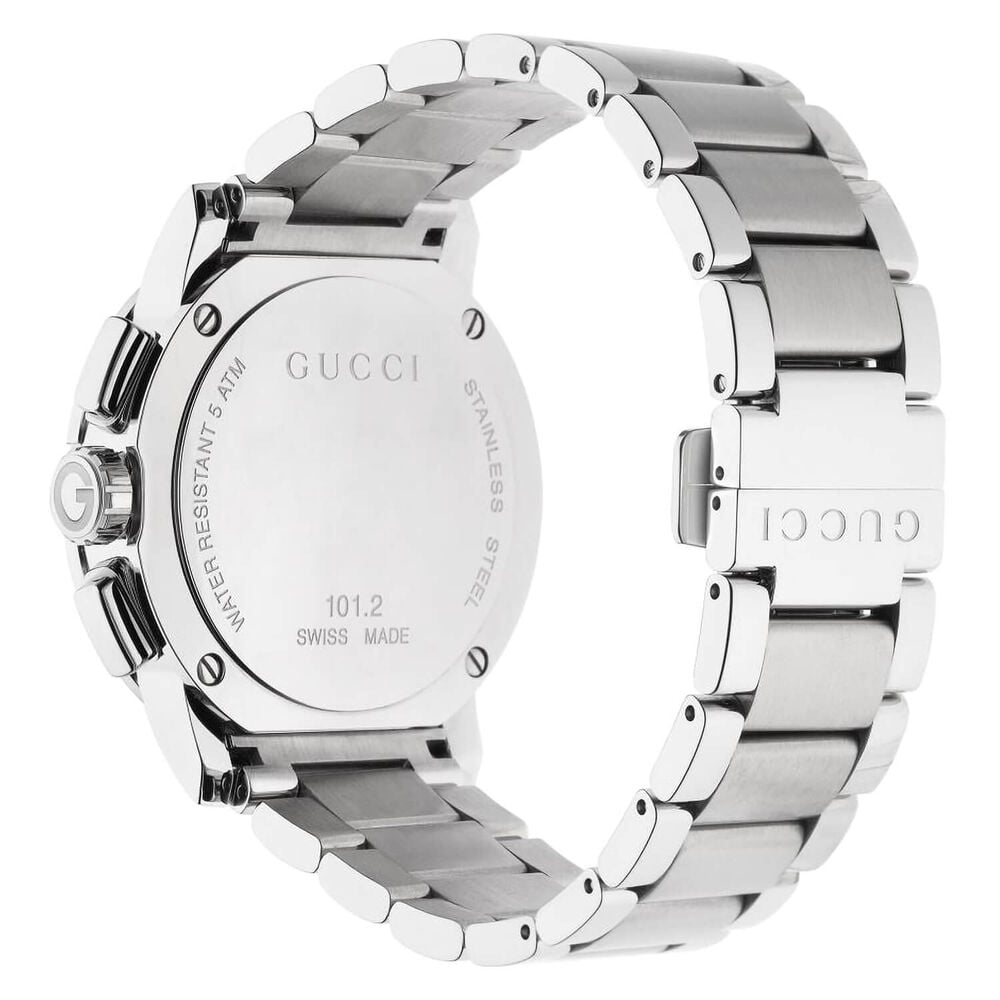 The G-Chrono watch is defined by the iconic G-shaped bezel, paying homage to the House. The contemporary design lends a modern, sporty look featuring a steel case with a black guilloché dial. The look is finished with an elegant stainless steel bracelet. The watch is water-resistant up to 50 meters and comes with a 2 year international warranty.